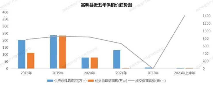 2023年上半年郊县土地累计供应508亩,可建面77万㎡;成交土地面积439亩,可建面63万㎡;土地成交均价193万元/亩、土地成交楼面均价1345元/㎡。为5年期历史最低值,郊县土地市场成交呈现持续下跌态势。