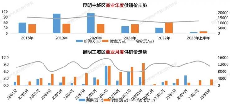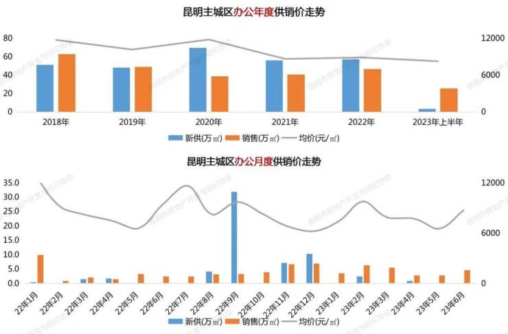 2023年上半年昆明主城区办公仅供应3万㎡,同比下降3%;主要为招商公园大道供货。成交26万㎡,同比上涨26%;主力成交项目润城、建投滇SHOW、绿地香树花城等。成交均价8248元/㎡,同比下降19%。