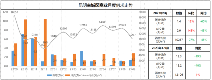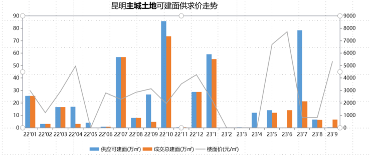 2023年1-9月昆明全域土地累计成交可建面185万㎡,同比上涨1%。