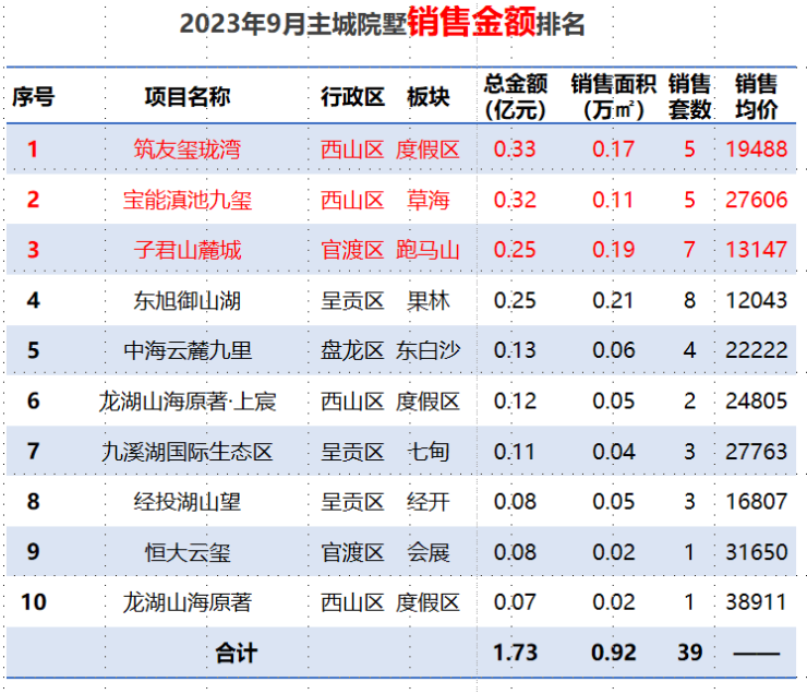 本月院墅成交1.2万㎡,环比下降13%,同比下降54%;主力成交项目东旭御山湖、子君山麓城、筑友双河湾、宝能滇池九玺等项目。