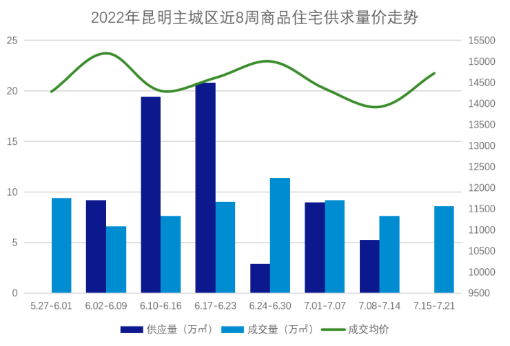 本周昆明主城区及呈贡区商品住宅新增供应0万㎡;成交量8.59万㎡,环比上升13%,备案成交均价14411元/㎡,其中,剔除西南海、云青花园、建工新城等历史备案项目后成交均价为14722元/㎡,环比上升6%