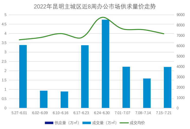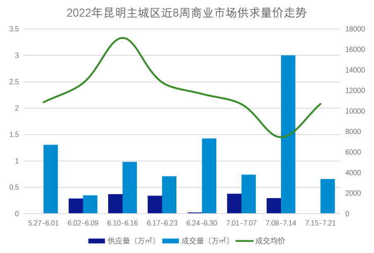 本周昆明主城区及呈贡区商业市场新增供应0万㎡;成交0.66万㎡,环比下降78%;成交均价10705元/㎡,环比上升44%