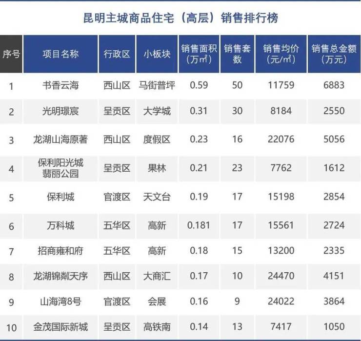 昆明主城住宅成交TOP10出炉!书香云海位居高层榜首