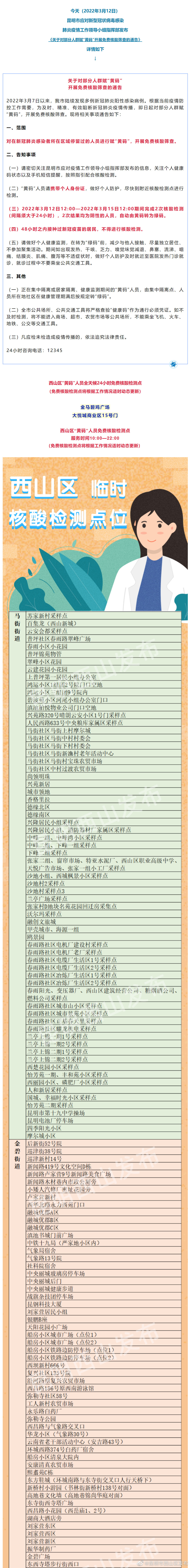 民生西山2022年3月12日,昆明市应对新型冠状病毒感染肺炎疫情工作领导小组指挥部发布《关于对部分人群赋“黄码”开展免费核酸筛查的通告》,详情如下↓