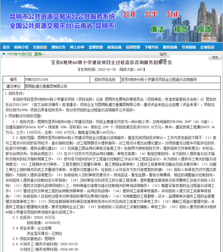 日前,昆明市公共资源交易服务平台发布了《呈贡B地块60班小学建设项目全过程造价咨询服务招标公告》。