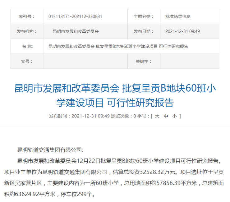 2021年12月31日,昆明市发改委网站公示了“批复呈贡B地块60班小学建设项目 可行性研究报告”,项目选址位于呈贡新区吴家营片区。