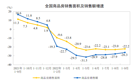 1—9月份,商品房销售面积101422万平方米,同比下降22.2%,其中住宅销售面积下降25.7%。商品房销售额99380亿元,下降26.3%,其中住宅销售额下降28.6%。