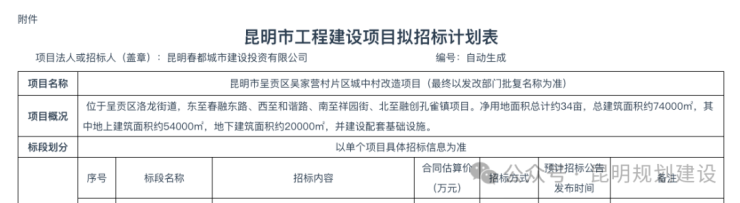 2月28日,云南省公共资源交易信息网发布《昆明市呈贡区吴家营村片区城中村改造项目》招标计划,根据计划,该项目位于呈贡区洛龙街道,东至春融东路、西至和谐路、南至祥园街、北至融创孔雀镇项目。