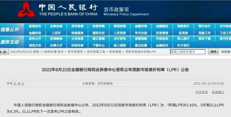 8月22日上午,全国银行间同业拆借中心发布较新贷款市场报价利率(LPR)。根据较新报价,1年期LPR为3.65%,5年期以上LPR为4.3%。