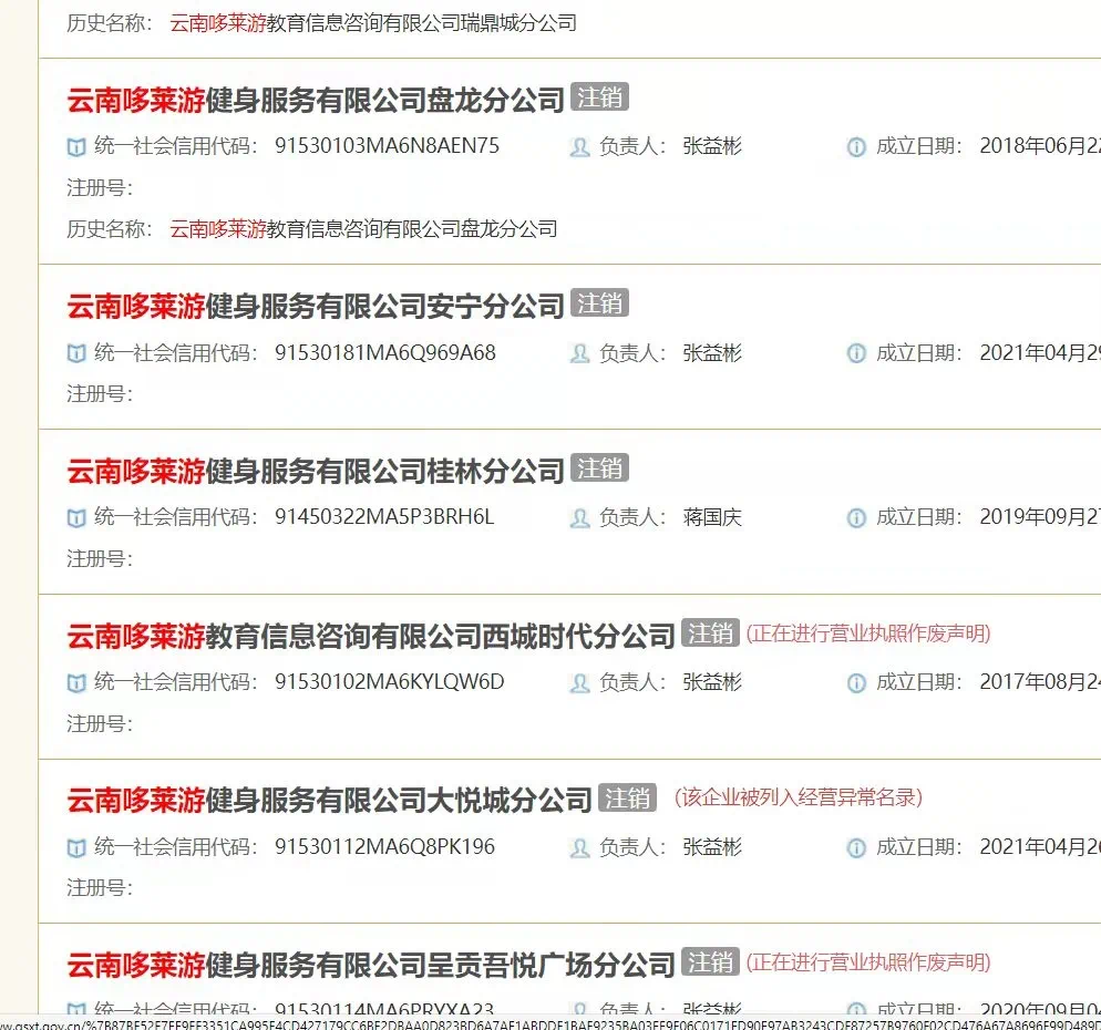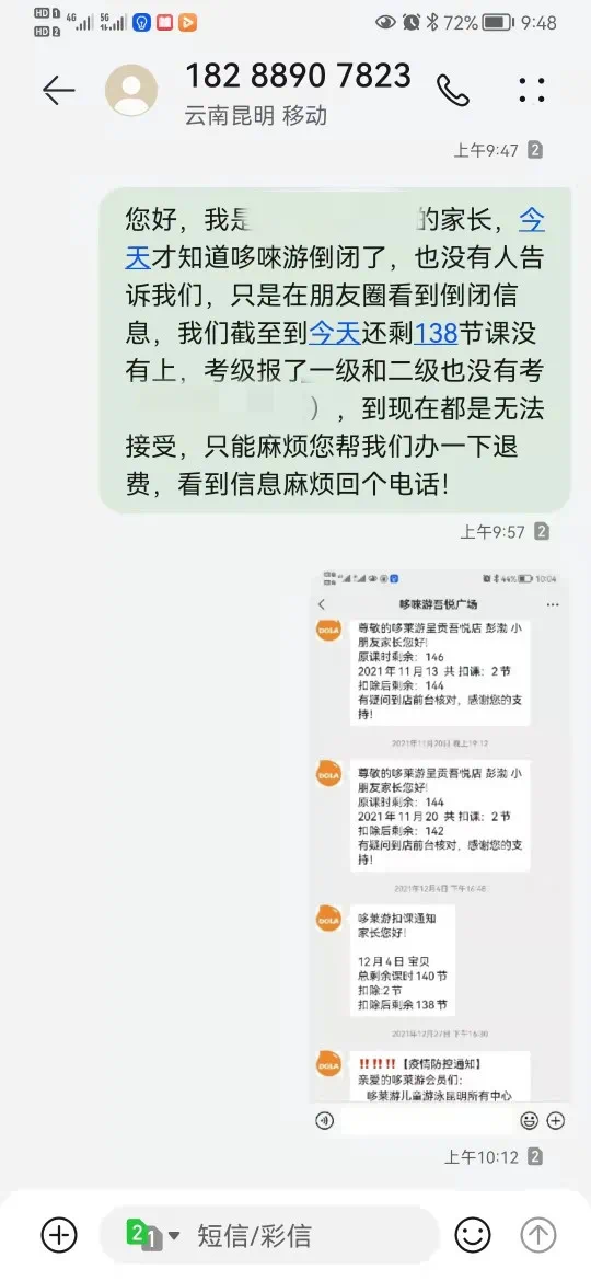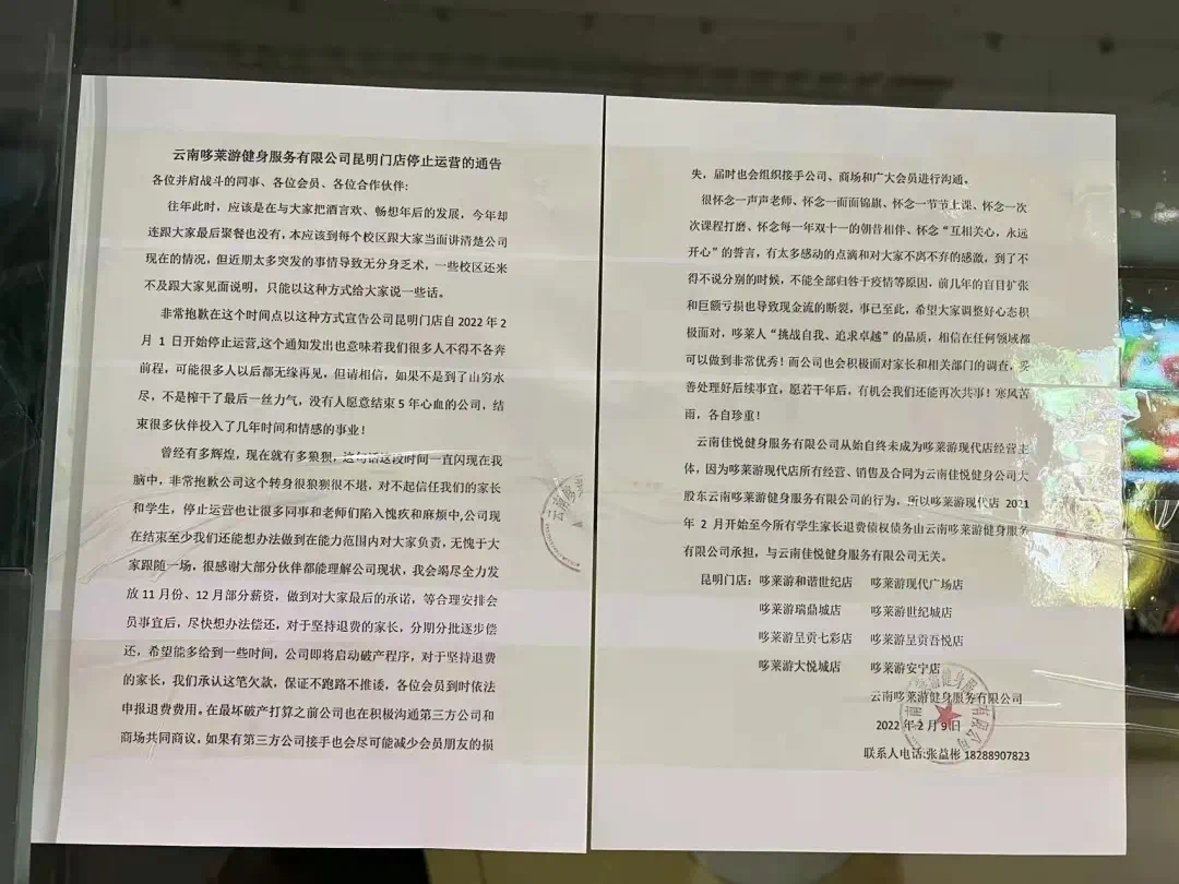 记者注意到,2月9日,一份署名为云南哆莱游健身服务有限公司张益彬贴出的停止运营通告中指出,该公司昆明门店自2022年2月1日开始停止运营。对于坚持退费的家长将分期分批逐步偿还,各位会员到时依法申报退费费用。