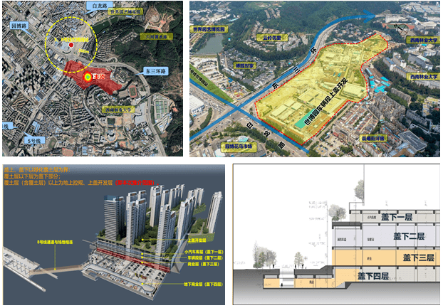该项目分为盖上部分和盖下部分,包括上盖开发层、小汽车库层(盖下一层)、车辆段层(盖下二层)、商业层(盖下三层,实为地面一层)、地下商业层(盖下四层,实为地下一层),是昆明地铁首个真正意义上的场段上盖TOD开发项目。