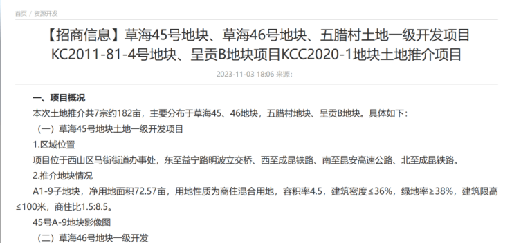 除了以上两个项目,昆明轨交此次还上架7宗土地,面积约182亩,包括商住混合、二类居住、商业金融业等用地,主要分布于草海45、46号地块,五腊村地块、呈贡B地块。这批地块将通过通过昆明市公共资源交易中心,以国有建设用地使用权公开交易方式完成供应。