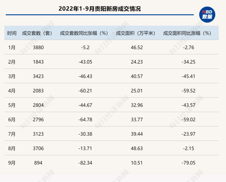 以贵州省会贵阳为例,中指研究院数据显示,今年1-9月贵阳新建商品房成交套数24552套,同比下滑43.42%;成交面积301.64万平方米,同比下降38.86%。而从销售价格上来看,据中指百城价格指数,贵阳房价连续多月环比下跌。此外,贵州省其余城市的房价调整压力同样较大。