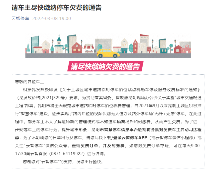 近日,昆明市智慧停车建设运营有限公司发布《请车主尽快缴纳停车欠费的通告》称,为进一步规范车主的停车行为,昆明市智慧停车信息平台近期将分批对欠费车主启动司法程序。
