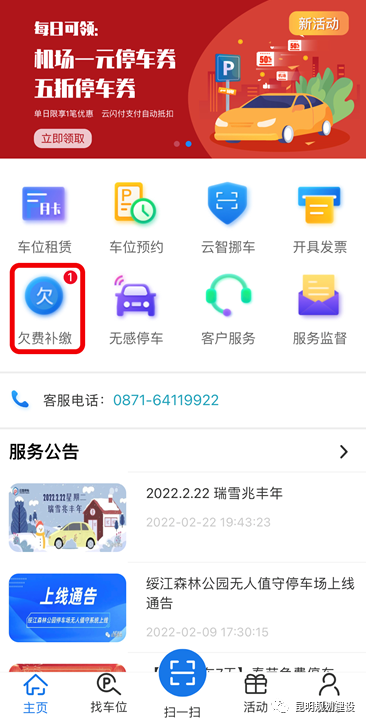 下载/登录云智停车App或云智停车微信小程序或关注“云智停车”微信公众号,查询欠费订单,即可缴费。