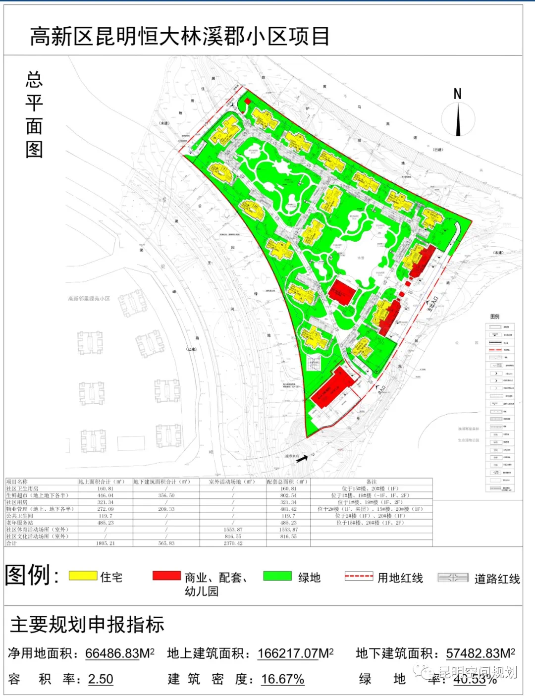 恒大林溪郡项目净用地面积为66486.83㎡,地上建筑面积为166217.07㎡,地下建筑面积为57482.83㎡;容积率2.5;绿地率为40.53%。