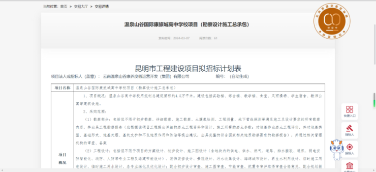 3月7日,云南温泉山谷康养度假运营开发(集团)有限公司发布了温泉山谷国际康旅城高中学校项目(勘察设计施工总承包)拟招标计划表(以下简称“招标计划”)。