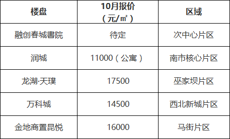 由表中数据可见,山水新城、斗南片区、东市区核心区、马街片区、南市区核心区、巫家坝片区、环湖东路片区、草海片区和中心区房价没有波动,共有8个片区报价维持与10月数据持平。