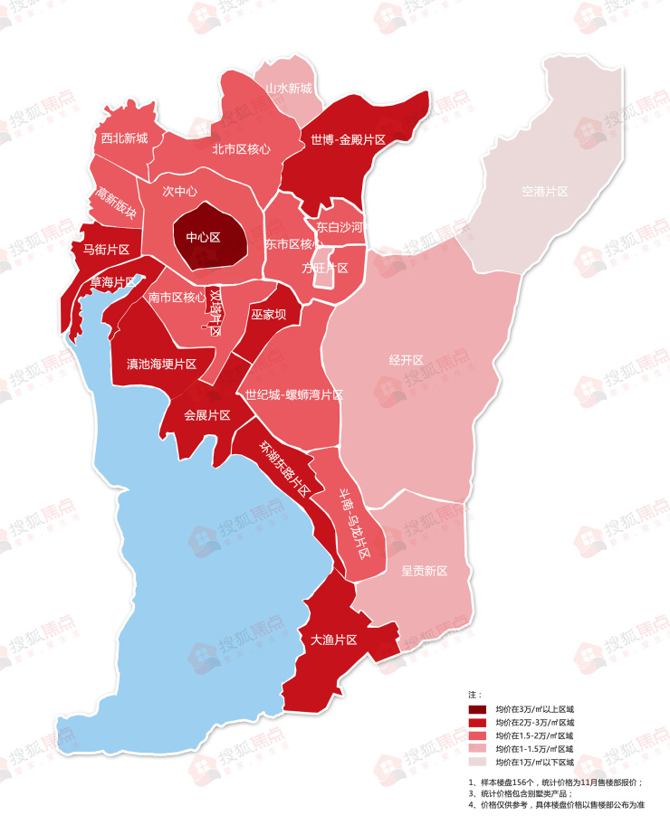 (注:区域价格由区域内楼盘价格综合计算得出,样本楼盘共156个,统计价格为售楼部11月报价,仅统计住宅产品,不含公寓价格,仅供参考。)