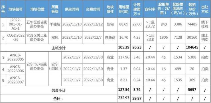 本周发布土地公告5宗,主城2宗,郊县3宗。五华区88.69亩纯居住地块二次挂牌,为云南葛洲坝园投公司参与一级整理的五华区普吉路以东片区城中村改造项目首期地块,三个月前首挂流拍;另一宗,官渡区KCGD2022-26 16.7亩位于双凤,为商住混合地块。郊县全部位于安宁郊区八街街道,全部为商业,合计127.54亩。