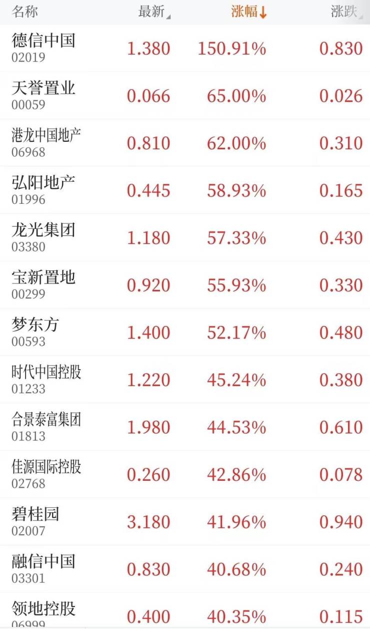 港股方面,德信中国领涨,涨幅一度达170%;弘阳地产、港龙中国地产、龙光集团、碧桂园、雅居乐集团、富力地产和融信中国的股票涨幅均在30%以上。