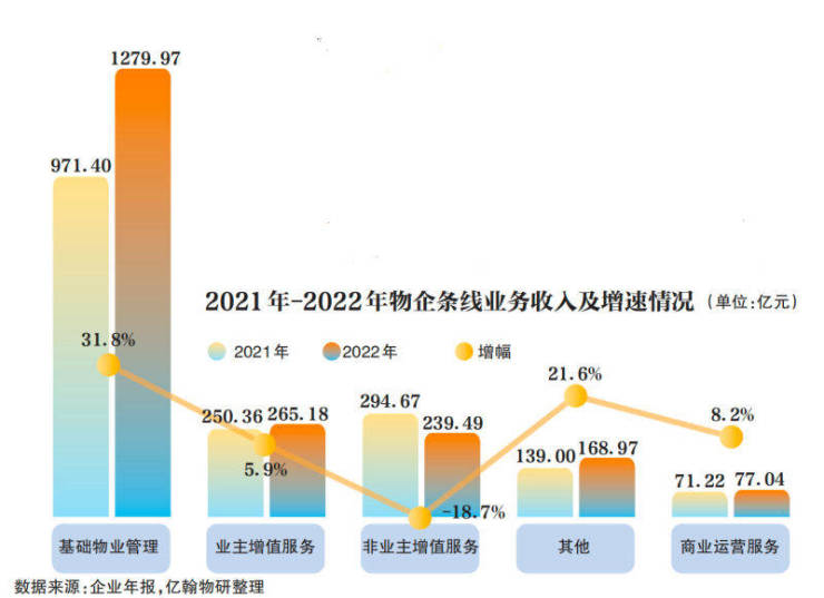 亿翰智库指出,2022年已披露增值服务数据的44家物企总收入为265.18亿元,相较于2021年的249.77亿元增长6.2%,总营收占比达到13.1%,业主增值服务超越非业主增值服务,成为物企第二增长曲线。