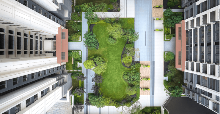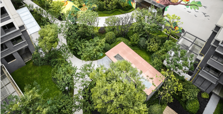 通过绿荫广场、逐光觅影林荫道、听风庭院等一系列的多维葱郁,