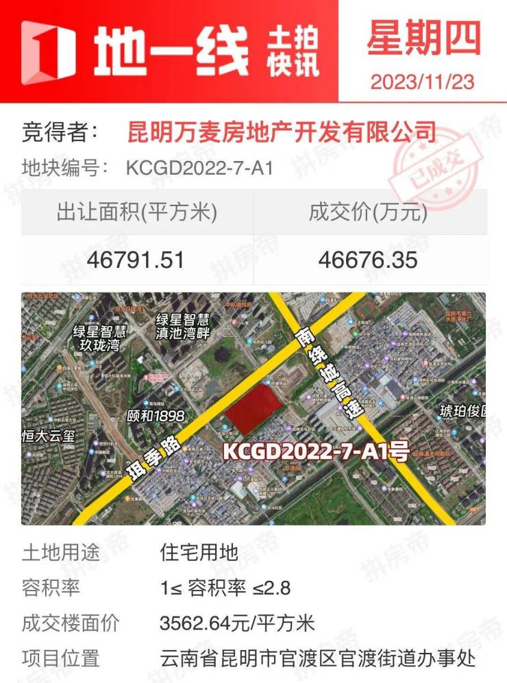 11月23日,官渡街道办事处成功出让约70亩住宅用地,地块编号为KCGD2022-7-A1号,由万科旗下公司昆明万麦房地产开发有限公司以4.67亿元底价竞得,成交楼面价约3563元/㎡,据了解,该地块万科将建成一个新项目。