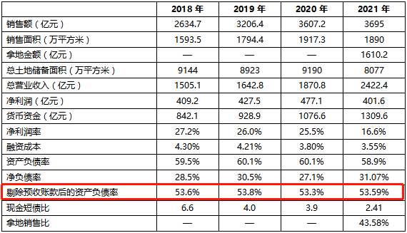 融资端,“三道红线”重压下,不少高杠杆扩张房企因难以维持债务的正常还款而暴雷,而中海在一线未踩的基础上,2021年期末持有现金1309.6亿元,加权融资成本仅3.55%,继续保持行业较低区间,剔除预收账款的资产负债率仅53.59%,安全边际充足。
