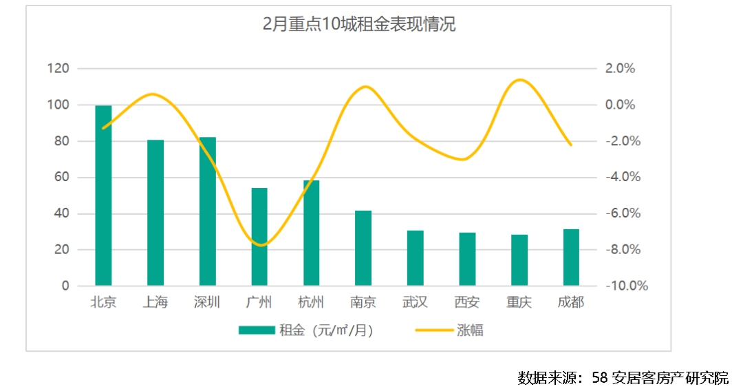 58同城、安居客统计数据显示,2月重点10城整体租金水平有所回落,仅上海、南京和重庆处于上涨状态,广州、杭州跌幅相对显著。2月,春节假期效应叠加部分城市受疫情影响,导致租金水平在一定程度上有所回落。从特别租金水平来看,北京2月租金回落至100元/㎡/月以内,上涨压力有所缓解,但仍位居全国排名前列。武汉、西安、成都和重庆,在经历去年租金的上涨后,整体水平位于30元/㎡/月左右,租房压力相对较小。