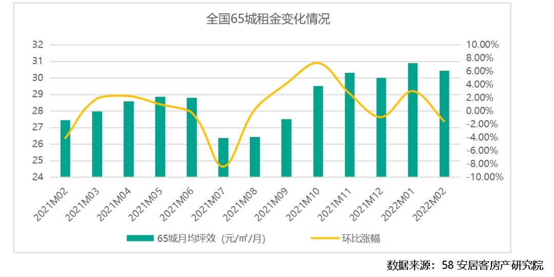 报告:2月65城平均租金30.43元/㎡ 其中40城租金下跌