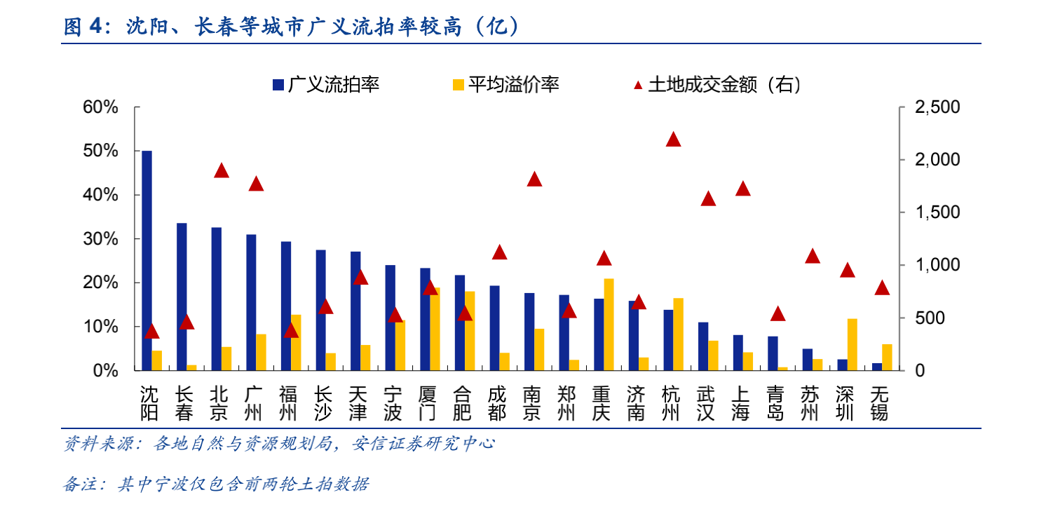 据安信证券统计,沈阳、长春等较低能级的城市全年广义流拍率较高,分别为50%、33.6%,苏州、深圳、无锡全年广义流拍率较低,分别为 5%、2.6%、1.7%。