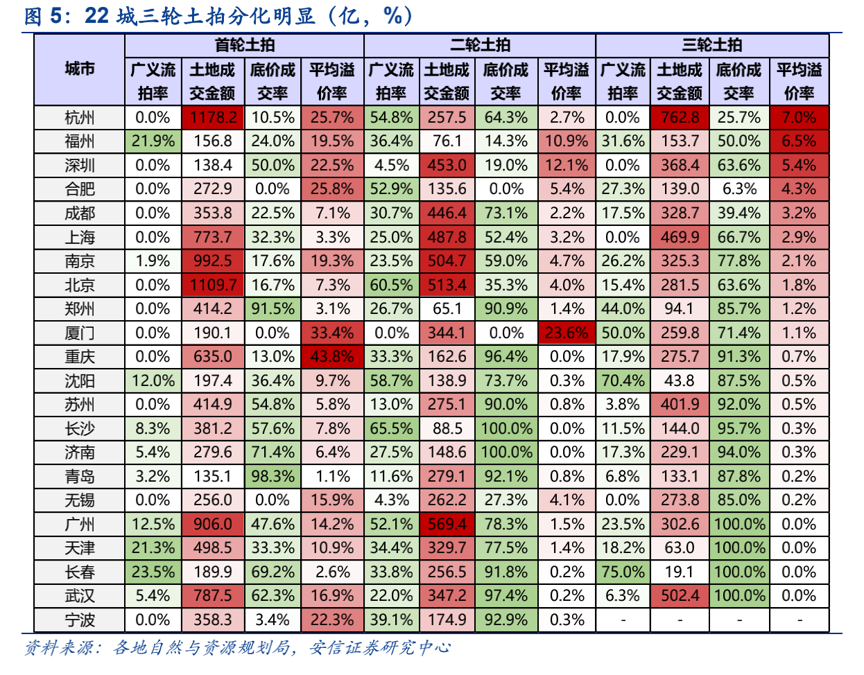 从首轮土拍为例,热点城市平均溢价率超过30%,个别核心地块竞拍超过百次,溢价率超过100%。