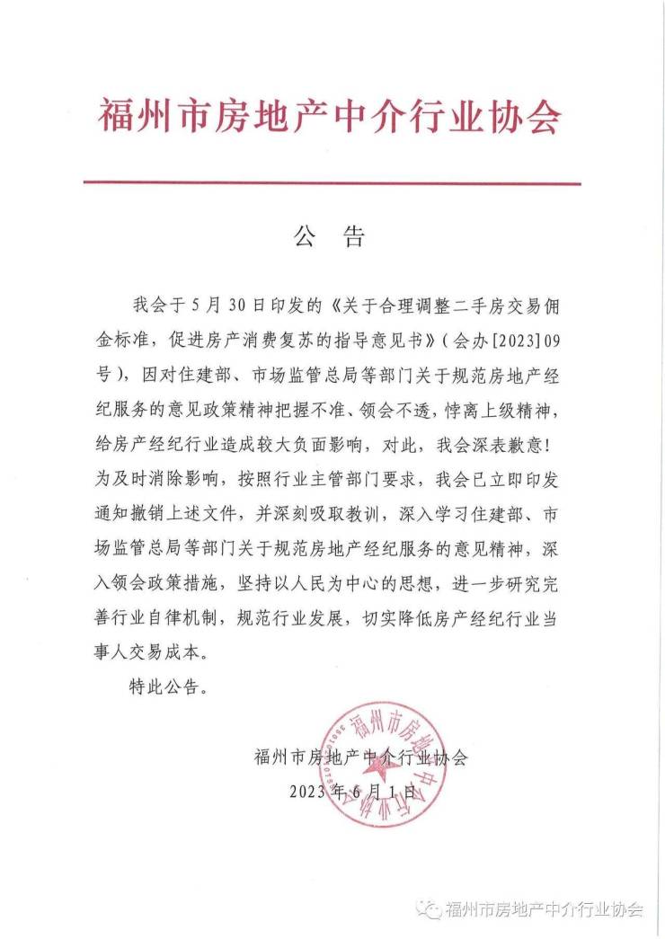 具体来看,福州市房地产中介行业协会表示,该协会5月30日印发的《意见书》,因对住建部、市场监管总局等部门关于规范房地产经纪服务的意见政策把握不准、领会不透,悖离上级精神,给房产经纪行业造成较大负面影响,对此,其深表歉意。