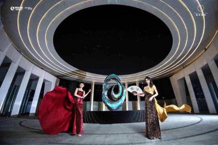 雕塑从设计到成型,经过了设计师数千次实验、演化与推敲。从3D 打印建模到现场手工打磨锻造,工艺之繁琐,在整个昆明也很难再找出第二家。尤其是雕塑的琉璃部分,由于材料的特殊性,琉璃的成型需要经过数十道手工精心制作,现场进行了多轮的调试、装配及手工打磨,使不锈钢与琉璃相结合,才呈现了这份独一无二的高贵。