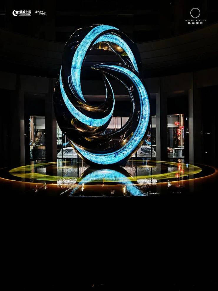 当夜晚灯光亮起,雕塑熠熠生辉,流光溢彩,底座的内置灯光散发出微光,勾勒出独特的纹理质感,石材、不锈钢、琉璃、玻璃玉石交相辉映,若隐若现,仿佛置身于梦幻,犹如艺术魔法般迷人。
