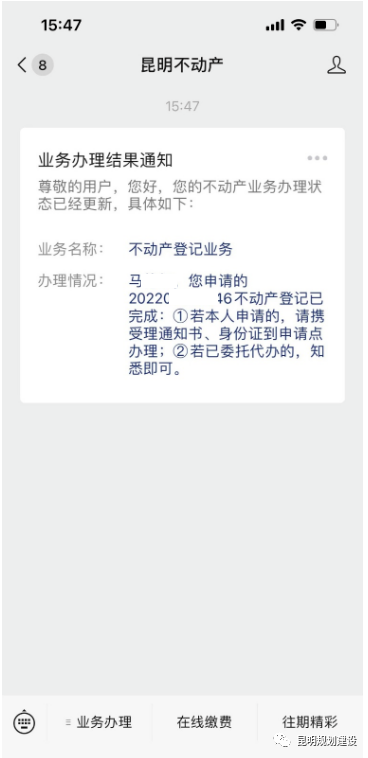 同时,市不动产登记中心在“昆明不动产”微信公众号已开通业务办理进度查询功能,申请人向不动产登记机构线上和线下申报登记时,只需要关注“昆明不动产”微信公众号,相关登记业务办结后,就会收到公众号推送的办证进度信息。