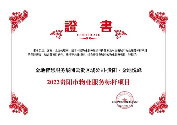 金地物业旗下金地悦峰凭借良好的服务水平,获得“2022贵阳市物业服务标杆项目”及“2022中国五星级物业服务项目”殊荣。