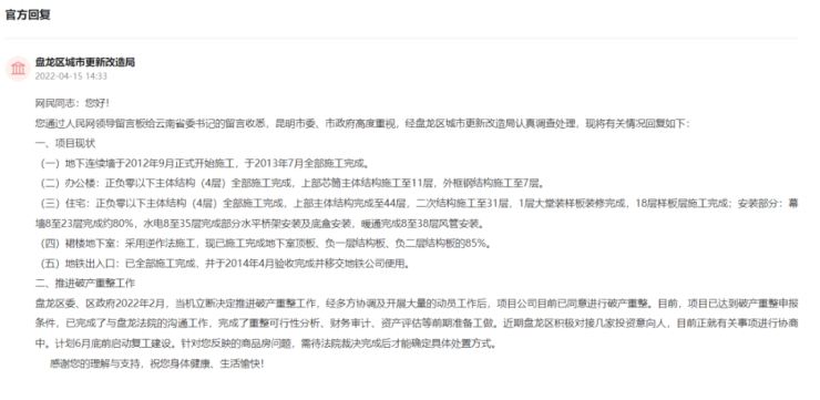 今年4月15日,盘龙区城市更新改造局在地方领导留言板上回复网友留言时表示,项目已达到破产重整申报条件,已完成了重整可行性分析、财务审计、资产评估等前期准备工作。项目计划6月底前启动复工建设。