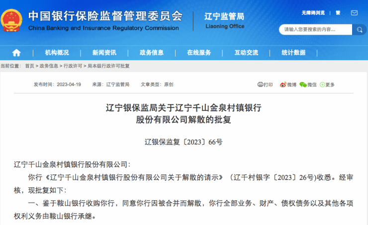4月19日,辽宁银保监局官网显示,批复同意辽宁千山金泉村镇银行因被鞍山银行收购合并而解散。