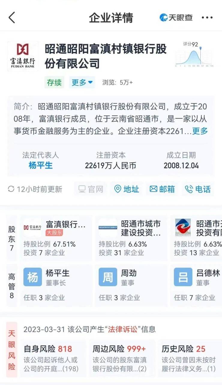 天眼查信息显示,昭通昭阳富滇村镇银行成立于2008年,注册资本2.26亿元,富滇银行以67.51%的持股比例成为其大股东和实际控制人。