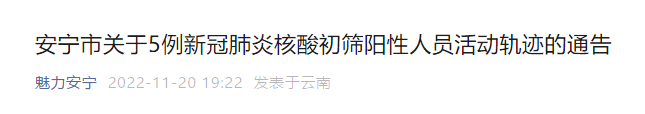 据“魅力安宁”微信公众号的消息,2022年11月20日,安宁市发布关于5例新冠肺炎核酸初筛阳性人员活动轨迹的通告。详情如下: