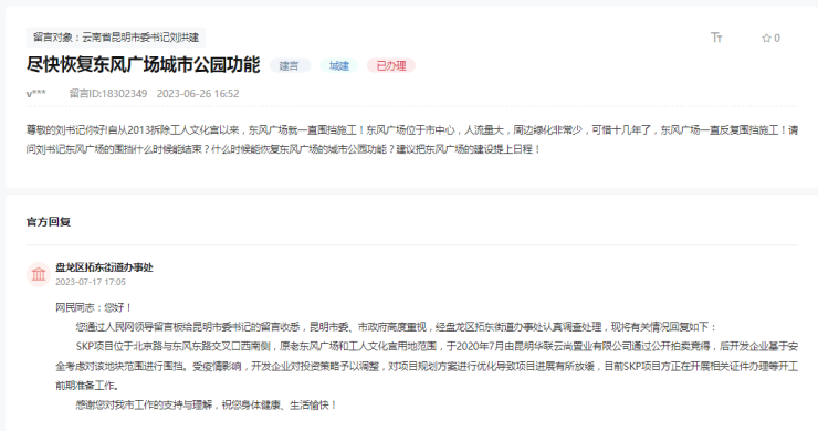 对此,盘龙区拓东街道办事处给出的回复是:SKP项目位于北京路与东风东路交叉口西南侧,原老东风广场和工人文化宫用地范围,于2020年7月由昆明华联云尚置业有限公司通过公开拍卖竞得,后开发企业基于安全考虑对该地块范围进行围挡。受疫情影响,开发企业对投资策略予以调整,对项目规划方案进行优化导致项目进展有所放缓,目前SKP项目方正在开展相关证件办理等开工前期准备工作。