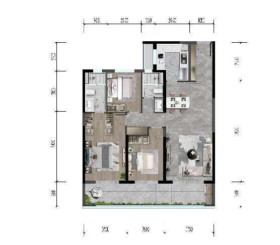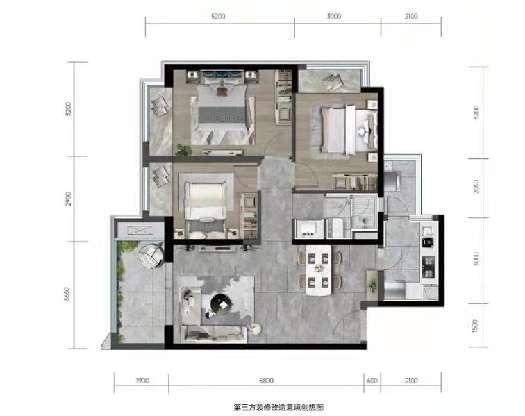 以建面约126㎡的高层户型为例——三室两厅两卫,户型方正。两个南向卧室和客厅相连,形成近18㎡的观景阳台,实现度假区高层业态的视野和采光优势充分展示。动静分区,主卧同样采用套房设计,让家庭成员的居住舒适性。入户玄关可做玄关柜增加收纳的空间,厨房U型橱柜设计,功能齐全使用方便。