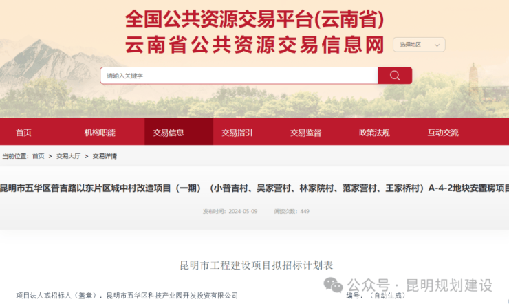 5月9日,云南省公共资源交易信息网发布了“昆明市五华区普吉路以东片区城中村改造项目(一期)(小普吉村、吴家营村、林家院村、范家营村、王家桥村)A—4—2地块安置房项目”的招标计划表,此次招标主要围绕着勘察服务、初步设计服务、施工图设计施工总承包、监理服务、全过程造价控制、检测工程进行。