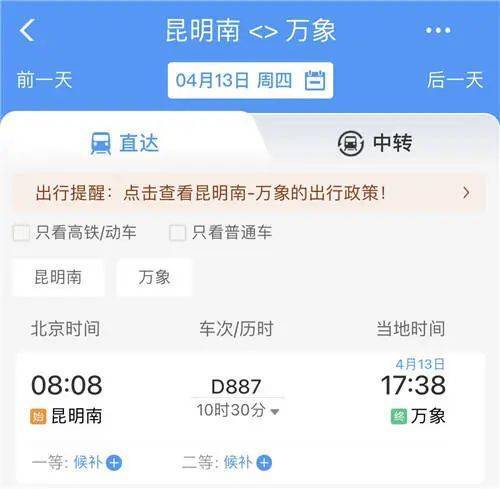 12306App显示,昆明南至老挝万象动车自4月13日起开行,车次为D887,昆明南8:08开,国内段经停普洱、西双版纳、磨憨,老挝段经停磨丁、琅勃拉邦、万荣,于18:38终到老挝万象,票价为二等座542元;一等座864元。