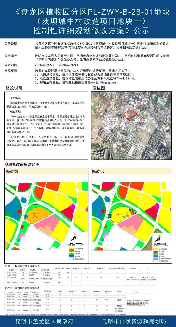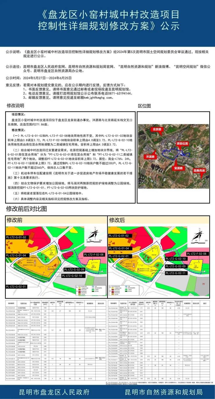 今日昆明昆明市自然资源和规划局发布五则公示,涉及盘龙区植物园分区PL-ZWY-B-28-01地块(茨坝城中村改造项目地块一)、盘龙区小窑村城中村改造项目、盘龙区昙华片区白龙寺城中村改造项目、盘龙区白塔分区PL-BT-F-03-01地块和度假区海埂片区B1、B2街坊,主要是针对这些项目的规划修改。