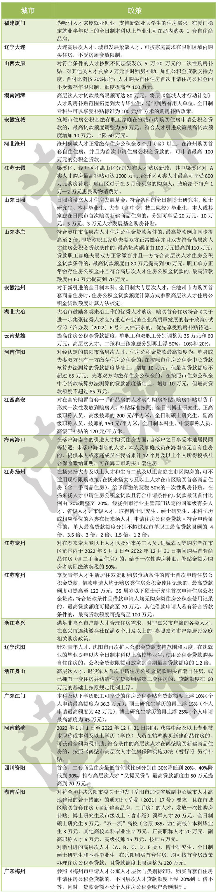 在对支持人才购房的政策中,多集中于提高公积金贷款额度、人才给予购房补贴以及优化限购政策等。在优化限购政策方面,以福建厦门为例,5月25日,据福建省厦门市房地产业协会消息,为吸引人才来厦就业创业,支持新就业大学生的住房需求,在厦门稳定就业半年以上的全日制本科以上毕业生可在岛内购买1套自住商品房。