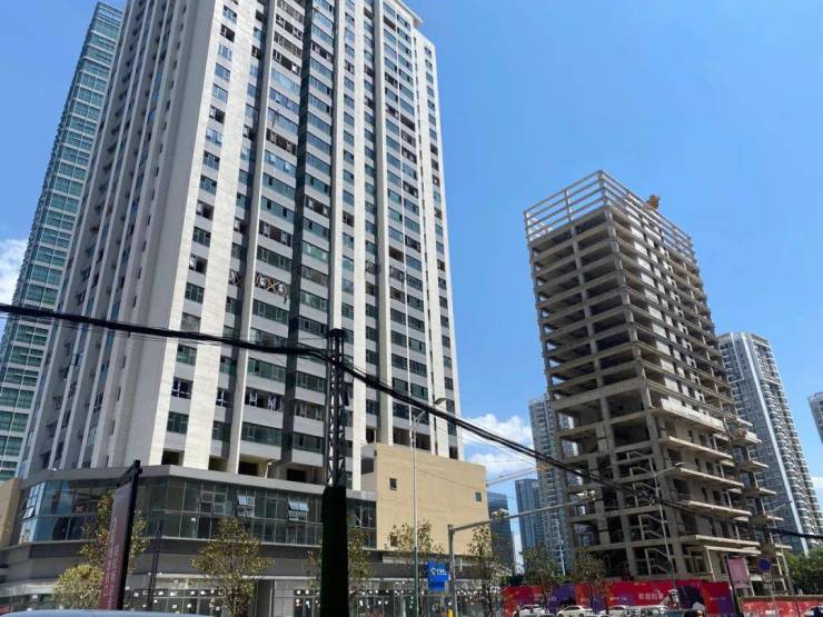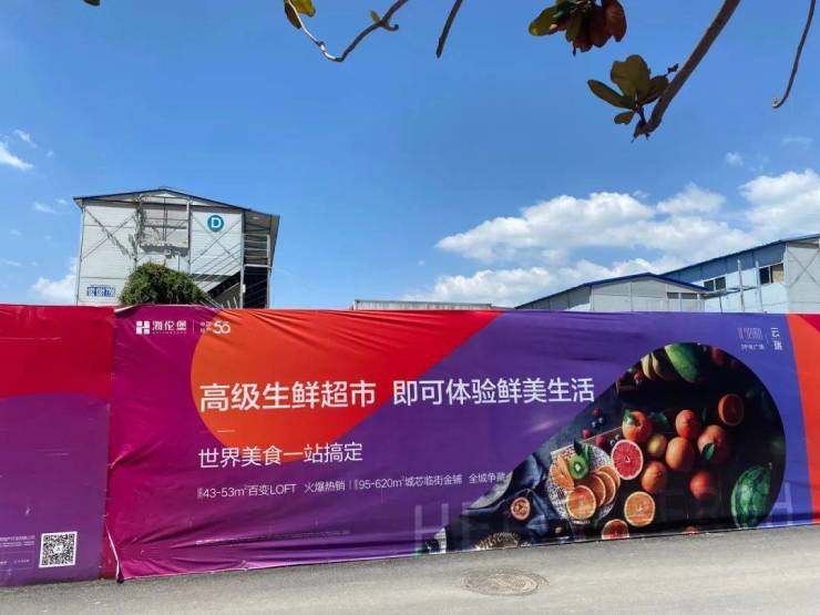 该项目的公寓楼已经交付,楼下部分底商已经开业,但没有看到盒马鲜生的招牌。公寓楼对面一处施工围挡上有项目广告,上有“高级生鲜超市,即可体验鲜美生活,世界美食一站搞定”的字样,但广告画面上并无盒马鲜生的logo或图案。