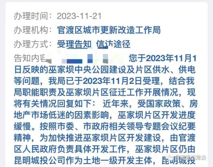 近日,有巫家坝片区的业主发布了“巫家坝配套设施及中央公园建设”的留言,留言中提到“希望有关部门积极争取中央专项国债资金用于巫家坝配套设施及中央公园”这一建议,11月20日留言得到了官渡区城市更新改造局的官方回复。